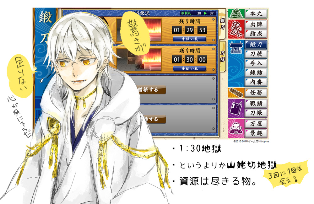 小狐丸も鶯丸も三日月さんも居ない我が本丸ではどんなレシピで挑もうが打刀ばかり、それもなぜか山姥切国広ばかりが鍛刀されすぎて山姥切で1ページ半埋まるほどに事態が深刻化。あまりに新顔がやって来ないことにより退屈を持て余した鶴丸(近侍担当)と 無為に資源を溶かし続ける審神者の心は次々死んでいく。そんな1週間。